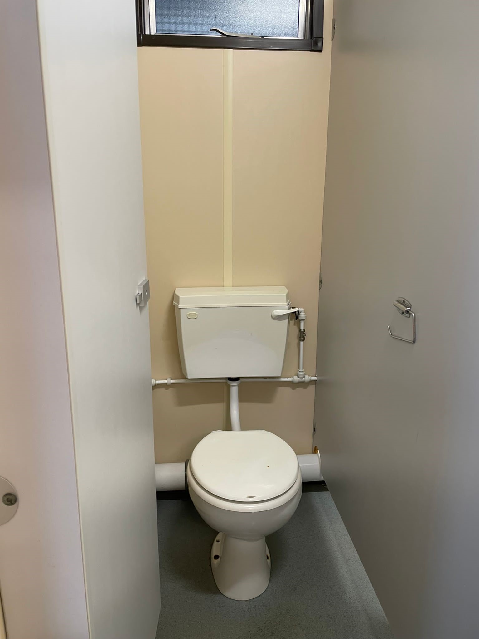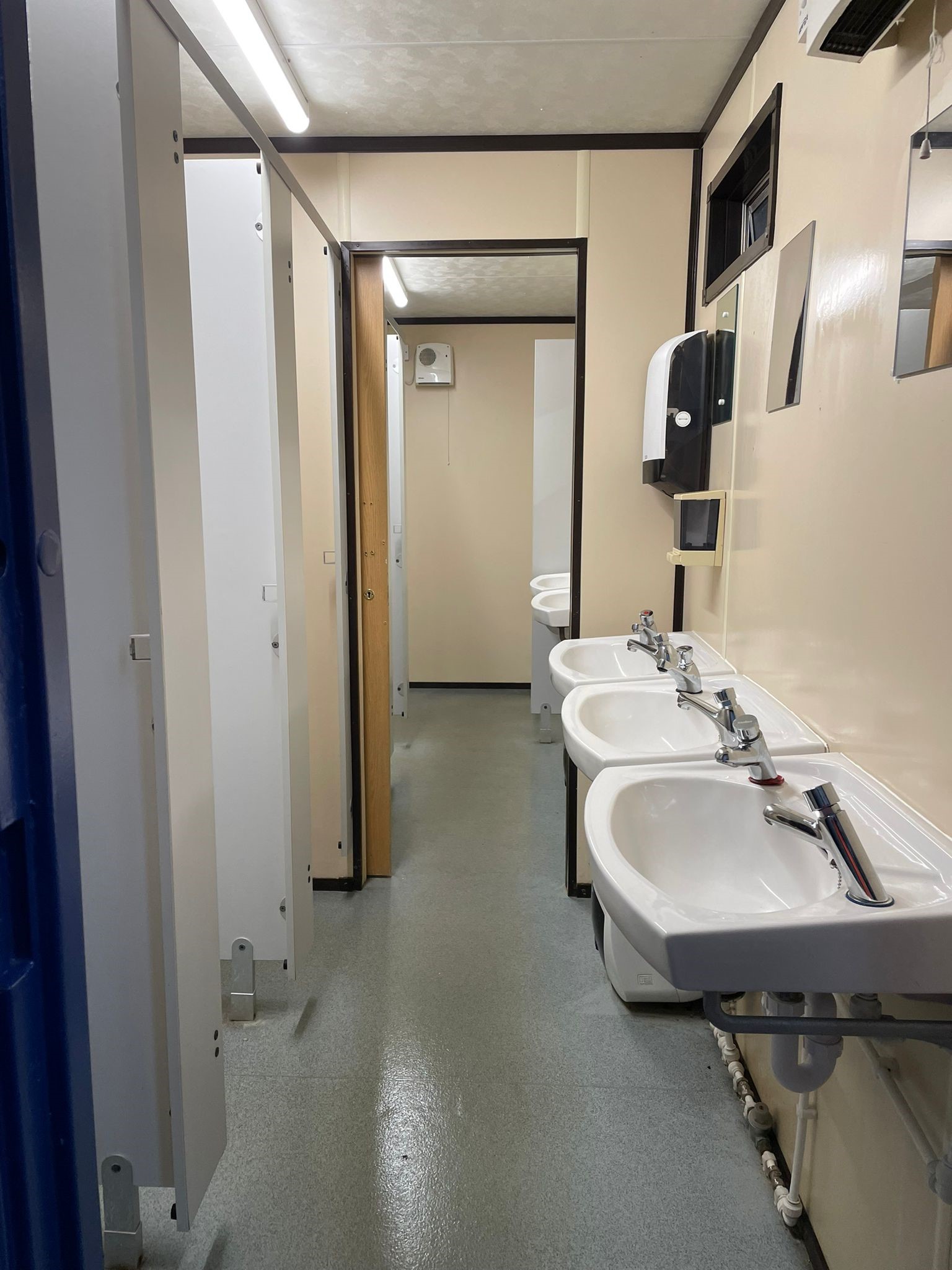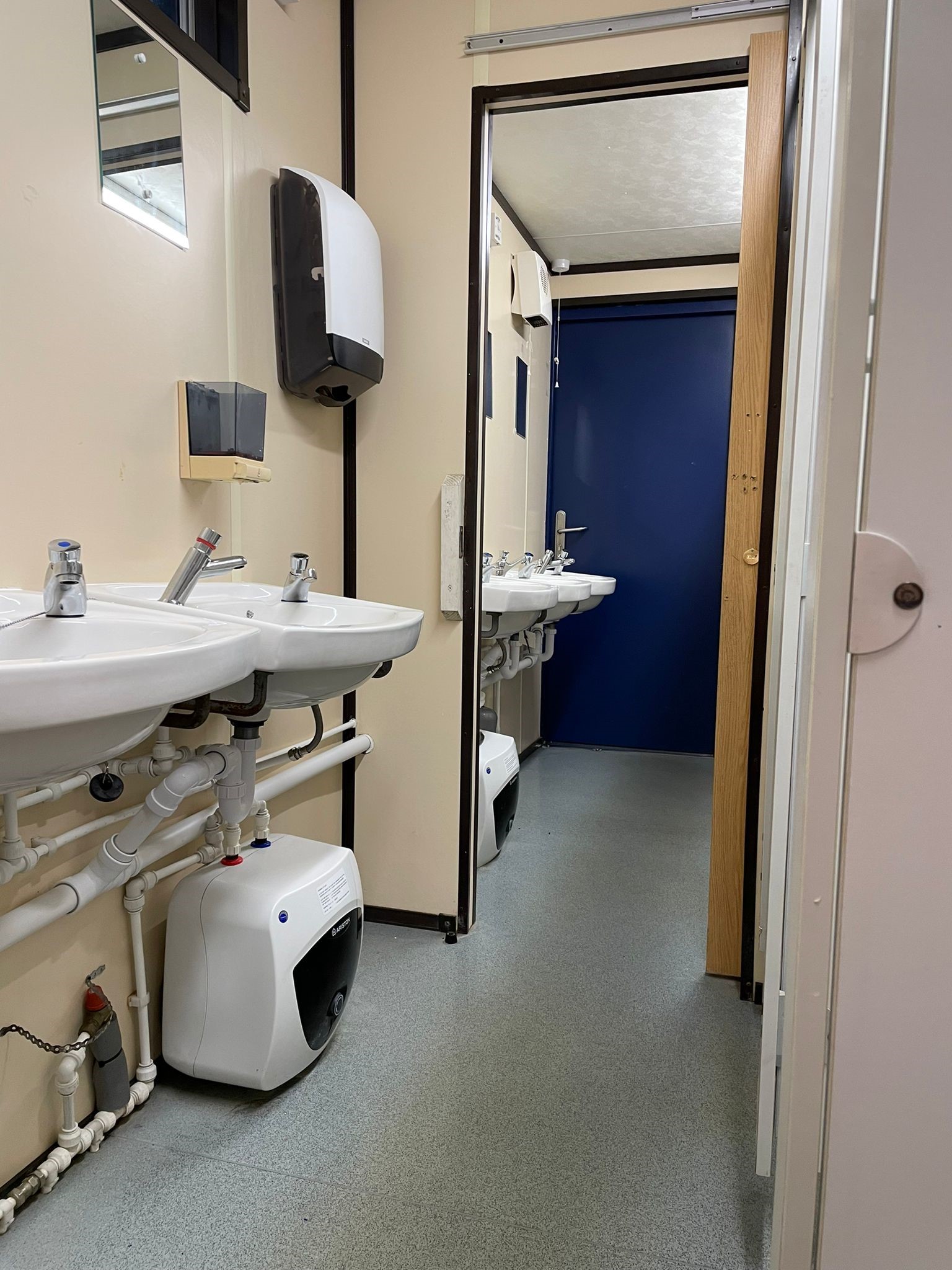 - Mains water and sewage connection; or sited over serviceable holding tank with clean water bowser and electric pump.